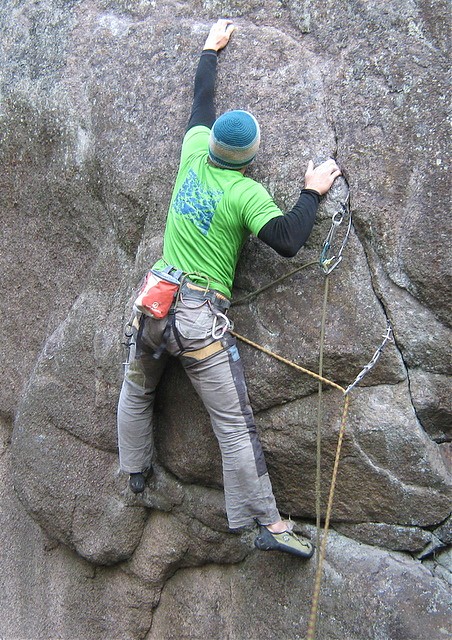 Kilka dni Wielkanocnych spedzilismy w Rudawach Janowickich.Dzieki informacją "kustosza terenu" Michała "Micaja" Kajcy który pracuje nad nowym przewodnikiem wydawanym przez Góry udało nam sie dokładnie zapoznać z terenem i poprowadzić ładna linię która wyceniamy na VI 1+ E4."Harry Spoter" to ładna droga asekurowalna przed trudnosciami ponizej połowy ściany prowadząca najpierw przez ukosna ryskę (asekuracja z małych c3 i rocksa 4) wyprowadzajaca na rajbungowa część drogi w której są trudnosci. W wypadku ewentualnego lotu asekurant powinien zbiec około metra w dół co uchroni wspinającego od "glebowania" ;).