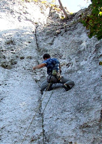 2.Rysa "Przez Kratę" VI 1 (E 3) stanowisko zjazdowe .Ładna linia startujaca krata zamykajacą dostęp do Jaskini Na Biśniku.Dobra asekuracja z friendów.W kominie pętla i potem ryzykowne wyjscie z niego.